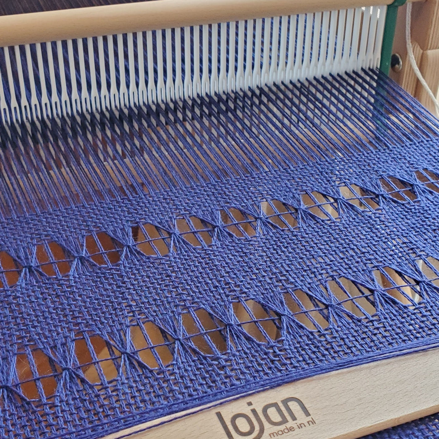 Je mets à disposition les métiers à peigne envergeur Flex Lojan 30 cm. Nous montons la chaîne le matin et nous tissons l'après-midi après un repas partagé tiré du sac.